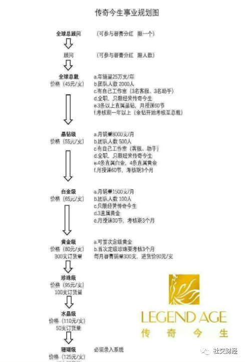 据了解,传奇今生采用的是层级销售模式,共分为7个等级,分别为珊瑚级、水晶级、珍珠级、黄金级、白金级、晶钻级和全球总裁,每个等级的拿货价都不一样,等级越高,拿货价越低。除了直接参与销售的这7个等级,传奇今生还设有顾问和全球顾问,参与分红。