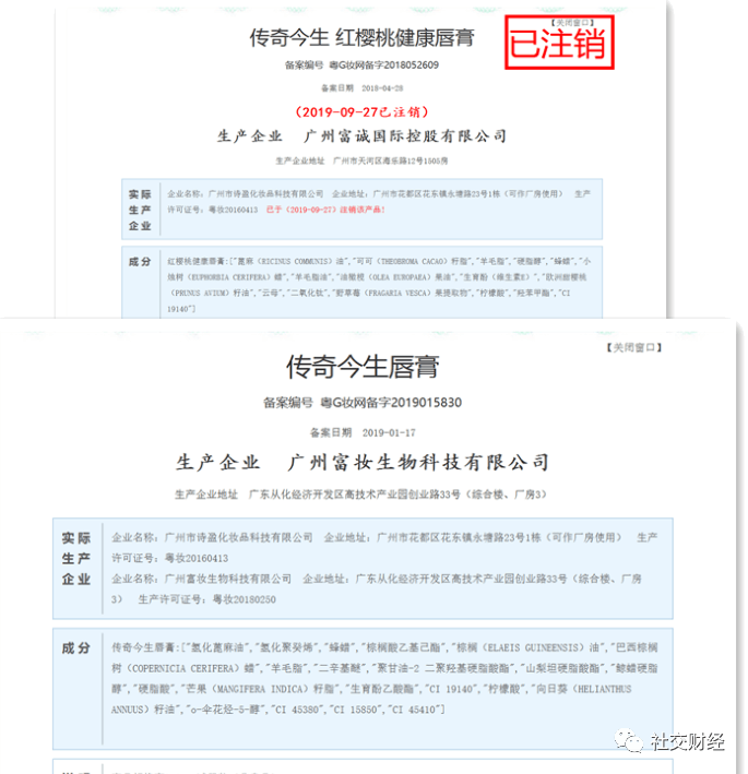 社交财经在“国产非特殊用途化妆品报备服务平台”发现“传奇今生 红樱桃健康唇膏”于2019年9月27日注销,取而代之的是广州富妆生物科技有限公司的“传奇今生唇膏”。