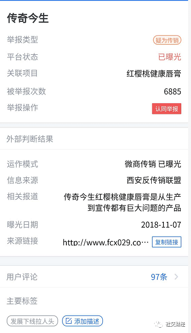 2019年3月,中国质量新闻网曝光了题为《传奇今生唇膏:拉人头 晒假单 “黑码”产品谁买单》新闻,该新闻显示,不少投诉人称“传奇今生红樱桃健康唇膏以晒假单造势,拉人头出货,请求退货遭‘黑码’等手段,让个别高级人员“躺赚”,大量代理却血本无归,甚至透支信用卡被银行催债。”