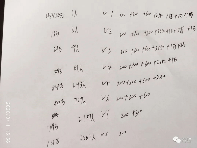 其次,鹰鉴发现该模式的计算方式存在严重错误。按照该模式计算到第八层的总人数是9814人,总投资额共计550余万元,如何支付给V7级别的1098万元呢。