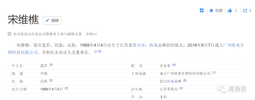 百度百科词条“宋维樵”显示:本词条部分内容由宋维樵本人参与编辑完善。宋维樵别名莲若,汉族,1989年4月4日出生于江苏省淮安市,欧束品牌的创始人,2016年6月7日成立欧束微商,并担任企业法人及董事长。广州微电商协会商学院理事长、广州美协常务副会长,欧束商学院院长。2017年创业故事被光明出版社《对话影响力人物》第三季丛书收录并全国书店发行。获得2016年度中国品牌榜“影响力人物奖”。