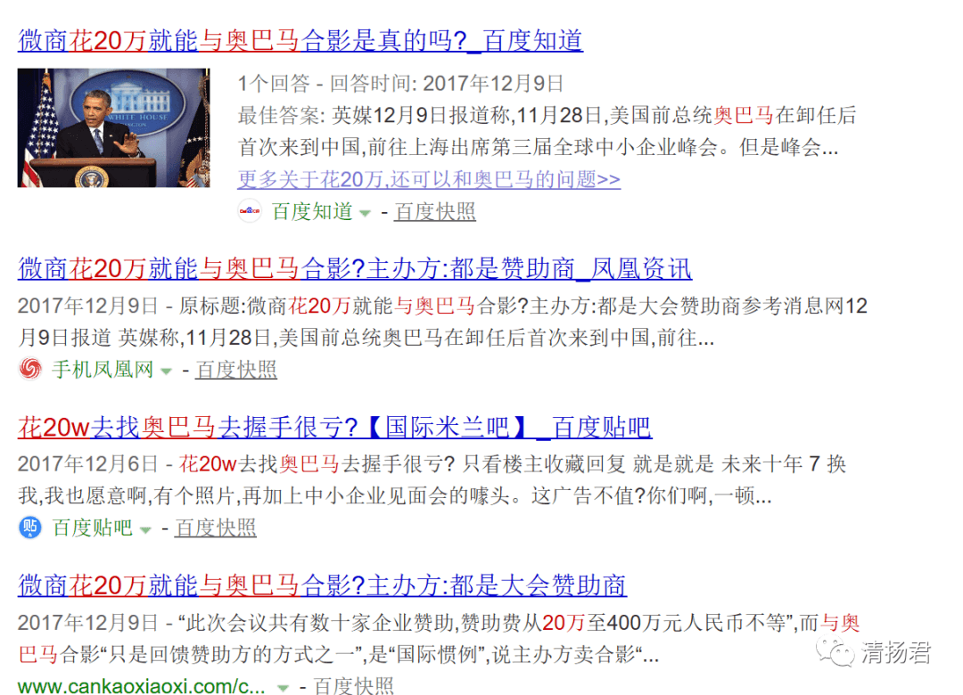 2017年,参考消息报道的《微商花20万就能与奥巴马合影?主办方:都是赞助商》一文显示,2017年11月28日,美国前总统奥巴马在卸任后首次来到中国,前往上海出席第三届全球中小企业峰会。但是峰会结束后,吸引众人关注的不是他的演讲内容,而是会后跟他进行的一张张合影。