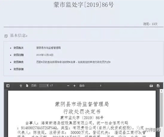 近日,中国市场监管行政处罚文书网公开了《蒙阴县市场监督管理局行政处罚决定书》,根据决定书,海南新港岛控股集团有限公司(新港岛集团)因组织、策划传销活动被罚没4000余万元。