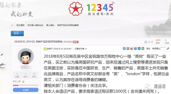 在苏州12345阳光便民网站上,就曾有网友投诉“英树产品名称中英文都含有‘英’、‘London’字样,包装也全是英文,误以为是英国产品,后来搜索发现只是在英国注册,实际是在中国生产、销售的产品,认为英树存在误导消费者。”
