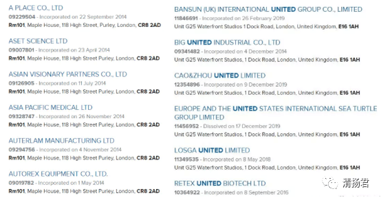 根据记录,英国芘蒂诗变更注册地址,最后一次是由Rm101, Maple House 118 High Street Purley London CR8 2AD变更为目前的Unit G25 Waterfront Studios 1 Dock Road London E16 1AH。经查询这两个地址上注册的公司不计其数(下图仅为部分)。