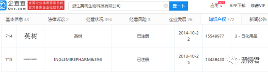 另外,英树于2013年10月25日和2014年10月22日分别申请注册了3类INGLEMIREPHARM’S和英树商标。