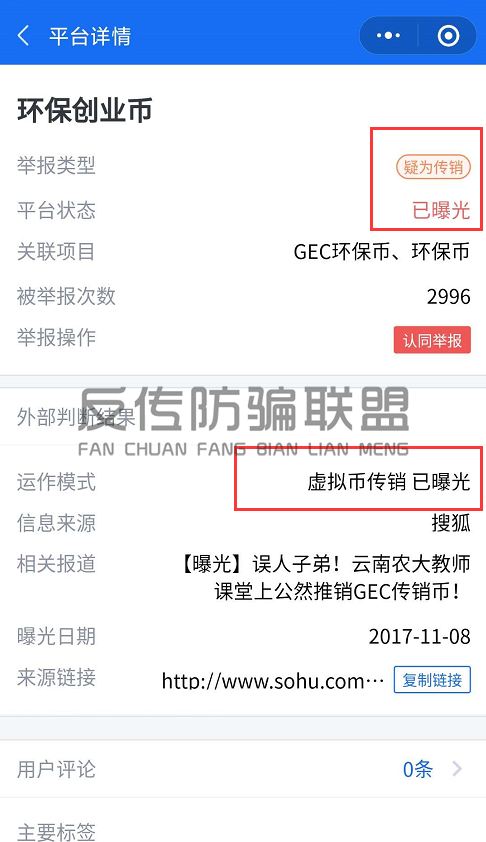 早在2017年11月8日,腾讯的灵鲲金融风险查询举报中心就已曝光过GEC环保币是虚拟币传销,两年多来,灵鲲金融风险查询举报中心对于GEC环保币发布传销预警的次数已高达2996次。