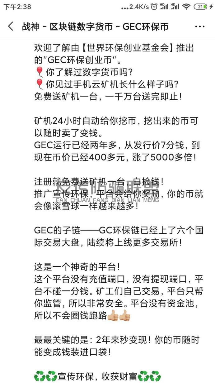 宣称“只涨不跌”的GEC环保币实为传销币,又一个资金盘骗局!