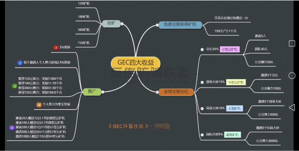 与其他“零撸”的虚拟货币一样,在GEC环保币中,要想获得更多的收益,必须通过拉人头或购买矿机来实现。