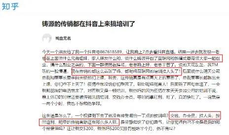 然而,俞凌雄却并不是上抖音传销的第一人。今年2月,昵称为“残血无名”的网友在知乎发帖《铸源的传销都在抖音上来搞培训了》,揭开了又一传销组织“铸源”携手抖音搞传销的骚操作。该网友称,2月22日晚自己被朋友拽进某抖音直播间,竟发现一老总大谈铸源开创的互联网新模式创业经,说辞天花乱坠,号召大家拉上兄弟姐妹、家人朋友等跟着铸源一起搞副业。休息时间刷个抖音还要“被传销洗脑培训、交5200办会员、等时间拿红利”,该网友直呼“现在传销的都这么嚣张了吗?”、“这世道是怎么了,一个权健倒下去了就没有接受哪怕一丁点的教训吗?”。
