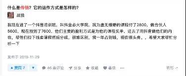 不仅如此,知乎上还有多位用户分享了自己在抖音平台遇到传销组织被骗的经历。不久前,昵称为“战狼”的知乎用户表示,参加抖音里“抖金必火学院”培训,“为虚无缥缈的课程付了2800,做合伙人5600,现在涨到了7600”,而该网友的主要任务,则是帮他们拉来更多人头然后分成,很明显是陷进了抖音的非法传销骗局。