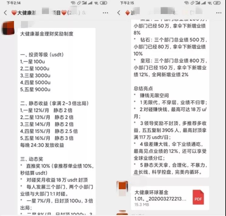 此外,李强还表示:“除了静态收益外,如果发展亲朋好友加入,还能获得动态收益,动态收益分为直推奖、对碰奖、领导奖、社区奖金等奖励。其中直推奖是指会员每直接发展一名下线,就可以从该名下线的投资额中提取10%的提成;对碰奖是指会员发展三个部门后,两个小部门的业绩就可以与大部门对碰。同时,会员级别不同获得的对碰奖也不同,从7%到11%不等,最终可以获得3倍到4.5倍不等的动态收益,对碰奖月收益高达18万美金;领导奖是指会员可以获得自己五代以内下线5%的对碰奖金,如果五五复制3905人,每天最高可获得117万美金,换算成人民币,每天的收益高达近700万元。”