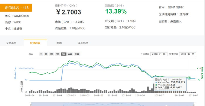从图上可以看到,维基链的流通量是1.4亿枚,从18块到2块多,市值蒸发了近22亿!多少投资者的血汗钱才能凑到这22亿,亏得血本无归的投资者们何处去说理,庄家的疯狂套现到底良心何在?!