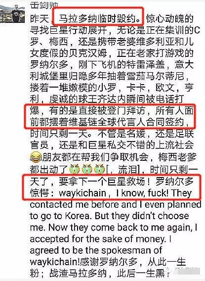 为什么世界杯的到来会给投资人如此大的信心和期待?原因之一就是世界杯之前维基链官方宣称将签约马拉多纳,可时间将近,创始人孙永刚就发微信称马拉多纳毁约了?试问这种大佬合作难道就是口头协议吗?书面的协议或解约或商榷的协议也没有,仅凭一条朋友圈就和诸多著名球星合作,反正这些球星也看不到这些胡说八道,骗人性质不要太明显。