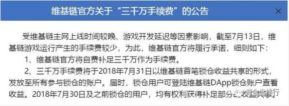 最后世界杯过后投资者们手续费没有收到,维基链发公告说自己补齐手续费给用户,但是条件很恶心人——必须是锁仓Wicc的用户才能得到此收益。