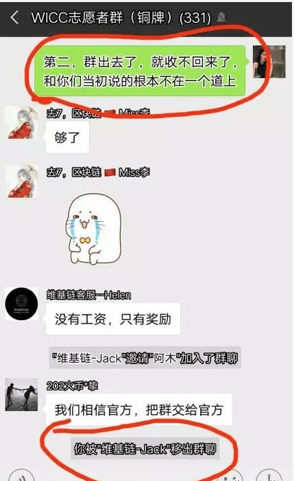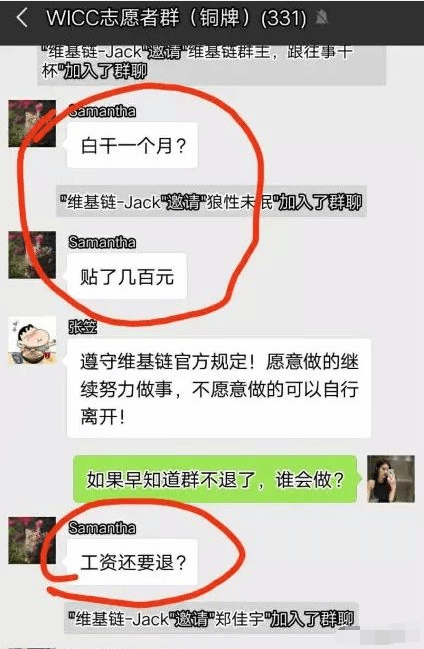 据有关爆料者披露,维基链雇佣了他们,给他们的任务是不断建群,每个群必须要300人以上,还要配合发朋友圈,给维基链塑造好的形象,给投资者充值信仰。然后做到了一个月竟然直发承诺的一半,不同意那就直接不发工资,还把他们的群霸占作为维基链的官方群。