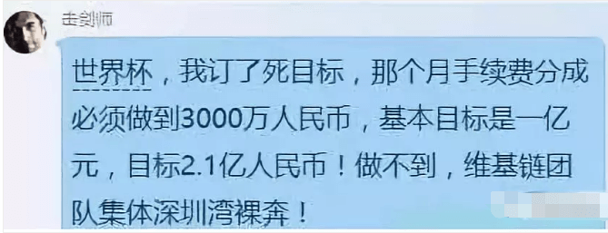 老王想着应该不会有失误,世界杯肯定是要举行的,而维基链正是做竞猜的,哪怕挣不了多少,起码应该不会亏。而且在深圳那个发布会上创始人“击剑师”宣布的目标是翻500倍干到1千美金,接着又在群里洗脑打鸡血,心里更加相信稳赚不亏,于是陆陆续续的又借了90万投入到维基链。