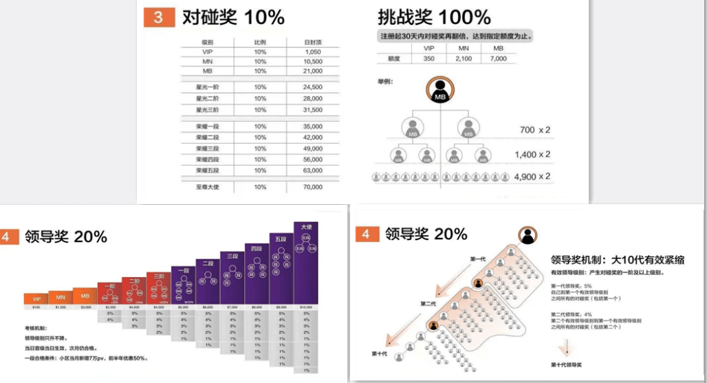 据警方破获的美极客传销案件来看,美极客网络传销组织通过讲座鼓吹参与会员可“日进万元”,设立三级发展模式:最低级别“VIP”613元起步,3000元“MD”经理级别、10000元“MB”流通商级别,成为会员后可以发展下线,并获得一定的提成。设立“直推奖、对碰奖、层碰奖”等销售奖金制度,按照层级不同享受销售产品收入的2.8%至48%作为提成回报,牟取非法利益,建立庞大传销体系。自2016年6月进驻大陆以来,发展会员已多达29万人次,遍布广东、北京、上海、等32个省、市,涉案金额初步统计约为8亿元人民币,涉嫌组织、领导传销活动犯罪。