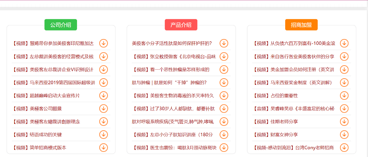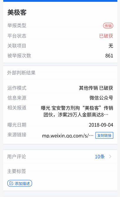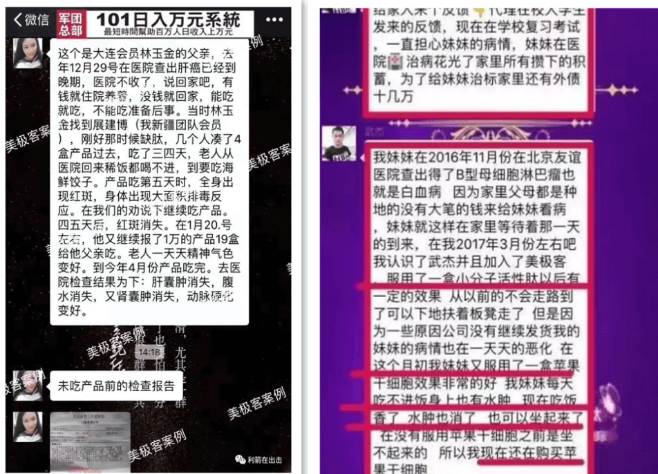 社交财经通过查询发现,美极客公司(又名迈捷普瑞生物科技公司)是新加坡的一家公司,百度百科上对这家公司的描述为“以销售‘苹果干细胞‘、‘低聚肽’等所谓高科技生物科技产品为幌子,采取‘拉人头’、‘收取入门费’、‘团队计酬’等方式骗取他人财物的传销性质的公司。”不仅如此,在网上也有大量关于这家公司虚假宣传其产品功效实施诈骗和传销的新闻报道。