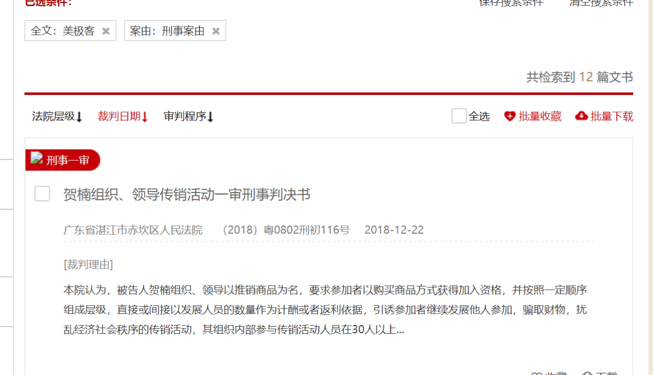 而据检方表示,“美极客”利用民众追求健康的迫切心理,先骗取钱财,随后进一步引诱被骗人从事传销活动。社交财经在中国裁判文书网搜索“美极客”关键词显示有相关文书20篇,其中涉及“传销”案件有12件,其年份显示主要集中在2018年。