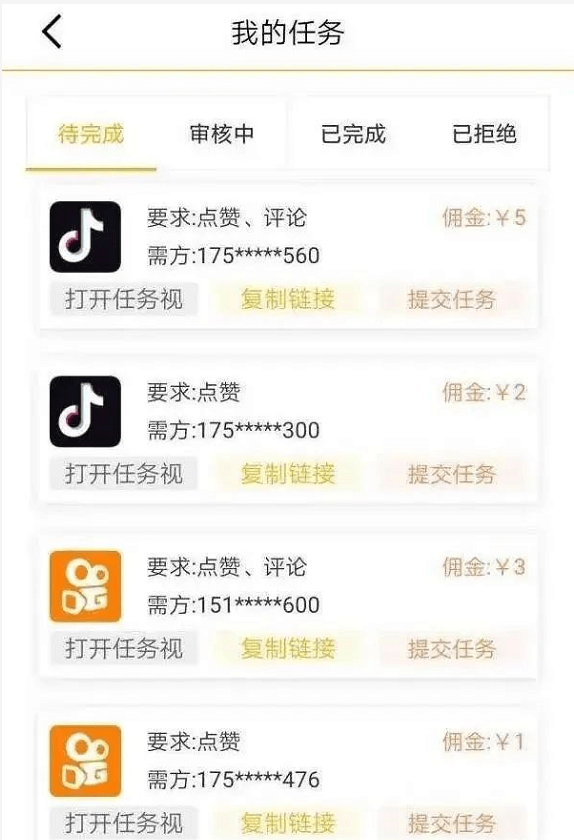 在任务页面,可以看到有很多“点赞、关注、评论”的任务,只要领取任务,对指定的抖音号完成相应操作,就可以领取佣金,累积到100元就可以提现到银行卡。
