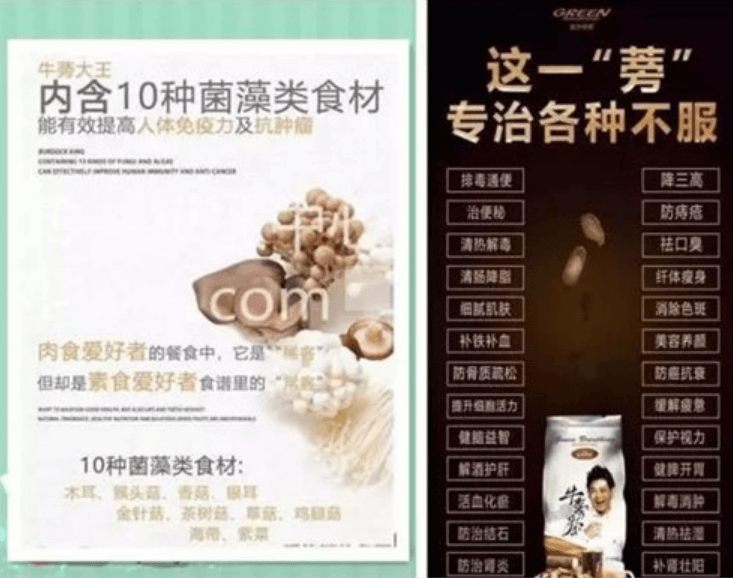 据牛蒡茶代理商曾宣称,牛蒡茶采用人工培植的新鲜牛蒡直根为原料,是在传统工艺基础上进行创新,运用先进的低温发酵和纯烘烤工艺精制而成的天然保健食品。而作为“保健食品”,牛蒡茶不仅可以排毒、调节人体平衡、预防癌症、降脂减肥、美容养颜、润肠、通便等功效,甚至还可以调节血糖血脂,降血压、胆固醇、健脾胃,补肾壮阳,对糖尿病、类风湿、肥胖症、癌症有明显的效果。