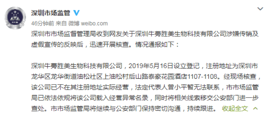 近日,社交财经在深圳市场监管微博发现一则通告,该通告显示,深圳市市场监督管理局收到网友反映深圳牛蒡胜美生物科技有限公司涉嫌传销及虚假宣传的反映后,迅速展开核查,情况通告如下: