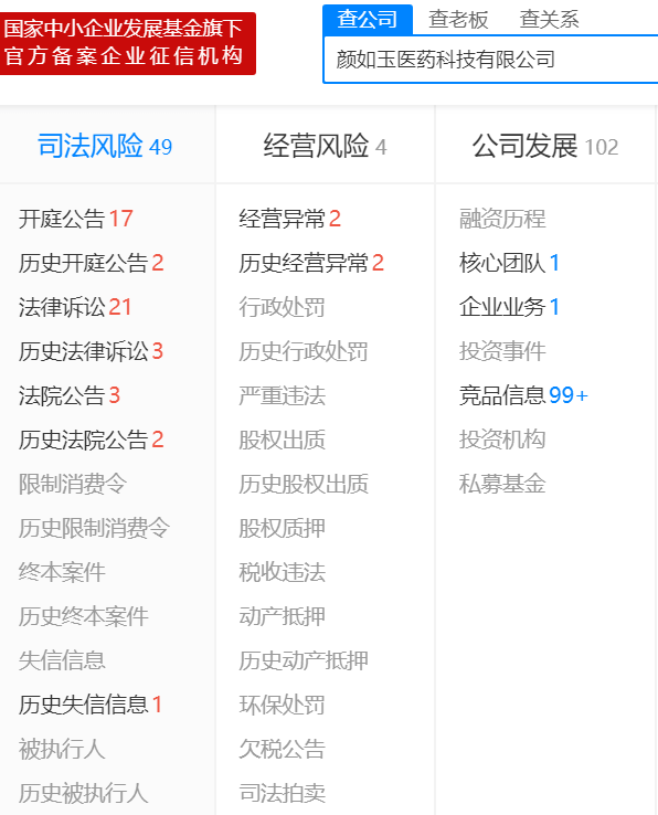 天眼查显示,颜如玉医药科技有限公司,原名广州颜如玉医药科技有限公司和广州特膳医药科技有限公司,成立于2008年7月11日,注册资本1.6亿元,实缴100万元(截止2018年年报统计),法定代表人李京卫,股东有李京卫与谢宁,谢宁为大股东;另外一家颜如玉的企业为广州颜如玉生物科技有限公司,该公司成立于2015年9月17日,注册资本500万元,法定代表人王中振,股东有钟鹏、谢涛、王中振。据公司官网介绍,颜如玉这个品牌的创始人是谢涛和王中振,公司目前的CEO是钟鹏。