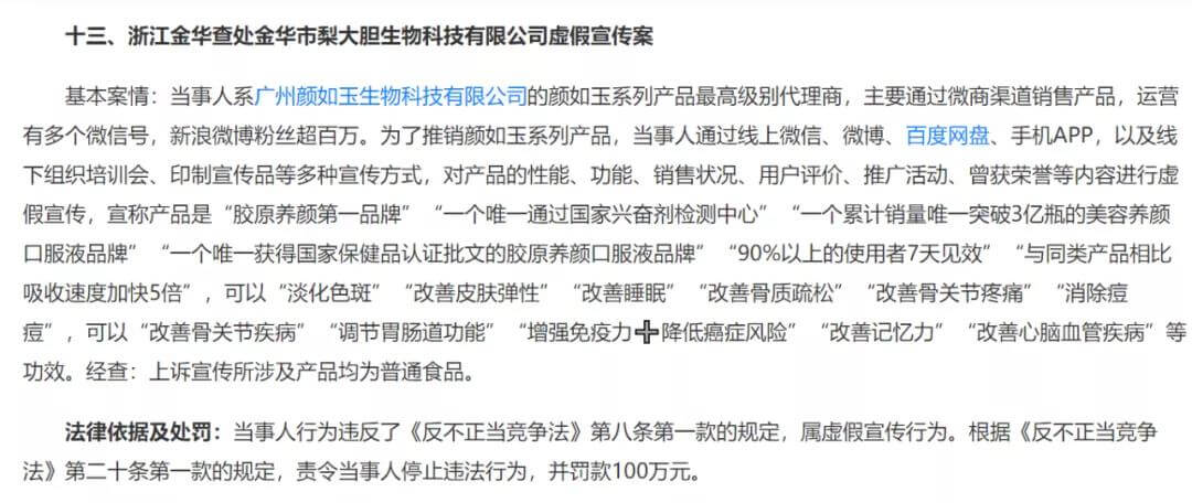 去年11月19日,国家市场监督管理总局在官网分三批公布联合整治“保健”市场乱象百日行动和反不正当竞争执法重点行动典型案例,共计30起。其中,广州颜如玉生物科技有限公司的颜如玉系列产品再次被国家市场监督管理总局点名。而“颜如玉”的最高级别代理商金华市梨大胆生物科技有限公司涉嫌虚假宣传,被罚100万元。