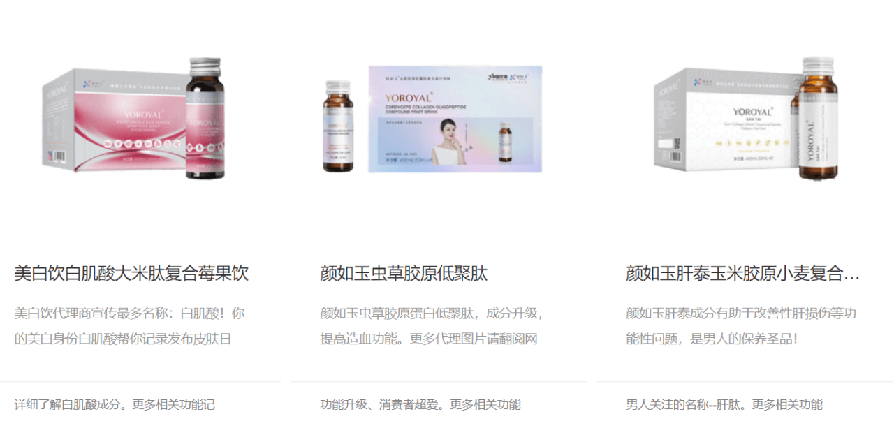 此外,一家名为中国女排颜如玉的网站(http://www.nvrenjiayuan.com/)上宣传颜如玉肝泰玉米胶原小麦复合肽果汁有助于改善慢性酒精性肝损伤、缓解或者逆转肝脏硬化等功能性问题,是男人的保养圣品;颜如玉虫草胶原蛋白低聚肽成分能够修复细胞提高免疫力,提高造血功能,改善排毒,加速身体循环等。