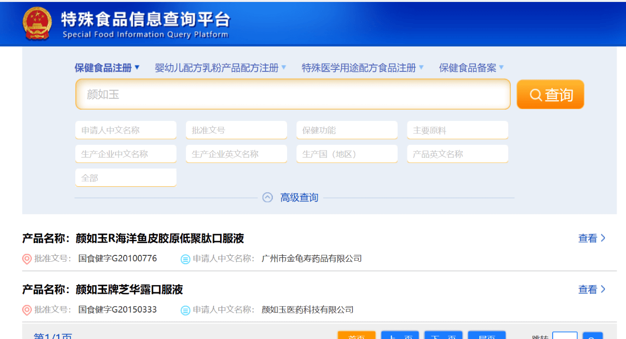 社交财经通过在“国家市场监督管理总局特殊食品安全监督管理司”查询发现,一款是广州市金龟寿药品有限公司的“颜如玉R海洋鱼皮胶原低聚肽口服液”,批准文号:国食健字G20100776,保健功能:改善皮肤水份。另外一款是颜如玉医药科技有限公司的“颜如玉牌芝华露口服液”,批准文号:国食健字G20150333,保健功能:抗氧化、祛黄褐斑。