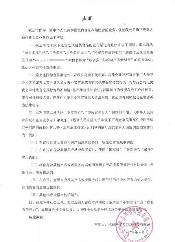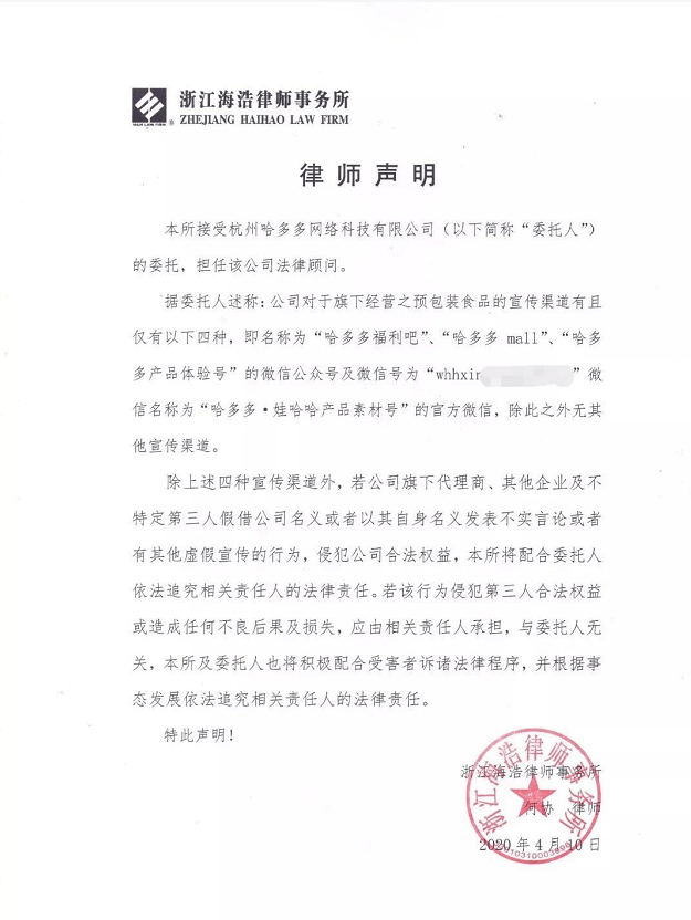 社交财经的报道刊发后,哈多多方面随即联合了浙江海浩律师事务所发表了公开声明,对所涉及报道的内容否认与哈多多公司有关。该声明指出,多哈哈平台认可的宣传渠道只有四家,分别是“哈多多福利吧、哈多多mall、哈多多产品体验号的微信公众号以及微信名称为“哈多多·娃哈哈产品素材号”的官方微信,除此之外无任何其他宣传渠道。值得说明的是,舆情观察网进入“哈多多mall”后却发现上没有任何内容,不知是没有发布任何信息还是已被清空了内容,不得而知。