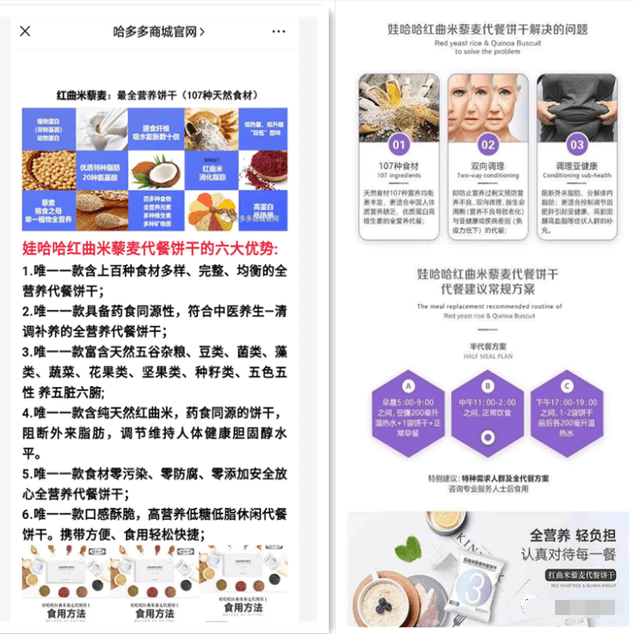 在一些公开的宣传材料上显示,娃哈哈红曲米藜麦代餐饼干中的红曲米具有阻断外来脂肪,调节人体胆固醇水平的效果,复补红曲米益生菌固体饮料中的鼠李糖乳杆菌具有提高免疫的功效;小伢儿益生菌固体饮料中唾液乳杆菌则能够激发免疫系统、改善过敏体质;启丽益生菌固体饮料中的瑞士瑞杆菌则具有专属的女性健康功能。