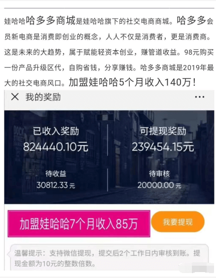 此外哈多多的经营模式也被指存在涉嫌传销。据了解,只要98元或128元的产品即可成为哈多多代理,同时获赠价值8888元12节课《小白如何成为大咖》,教授代理运营手法。同时宣称目前注册的会员已达50余万!有加盟者在做娃哈哈5个月收入便达到了140万!
