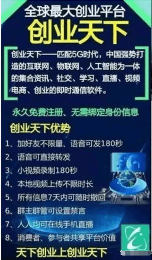 据公开宣传资料显示,创业天下是人联网,物联网,互联网三网合一,是5G技术,大数据,人工智能于一体的综合性新零售应用APP,是集聊天、社交、购物、学习、直播、教育、生活、创业等于一体的综合性的全球创业平台。