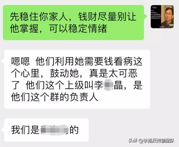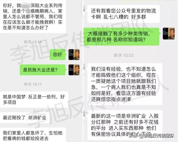 近期,有网友跟李旭反传销团队投诉称,自己癌症晚期的家人深陷大业系列传销,先后接触大狮集团、中*国*梦、非洲矿业国投基金、商务商会、DCEPAI等十几种项目,家人怎么劝说都不管用,不知道该怎么挽救。