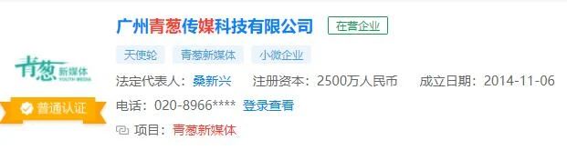 天眼查显示,青葱新媒体隶属广州青葱传媒科技有限公司,法人代表桑新兴,注册资本2500万,实缴100万,是一家专注于互联网+的新媒体营销策划公司,明星社群电商品牌一站式运营服务公司。2015年获得国际风险投资IDG资本投资。