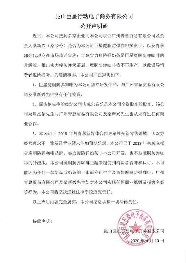近日,因桑新兴(桑兮兮)是否为巨星行动魔胴防弹咖啡操盘手,以及青葱部分代理商在市场造谣宣称:青葱实力瘦防弹奶茶是魔胴防弹咖啡的升级版,推出实力瘦防弹奶茶后,魔胴防弹咖啡将不再生产,误导消费者混淆视听,巨星行动向广州青葱贸易有限公司及负责人桑新兴发出严正声明,如下: