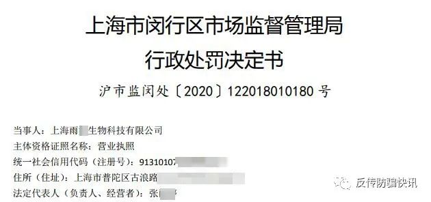 4月19日,反传防骗快讯了解到,上海市闵行区市场监督管理局对外披露了一起组织、策划传销案的行政处罚决定书。该处罚决定书上显示,上海雨某生物科技有限公司(以下简称:上海雨某公司)因采用以下线的销售业绩为依据给付上线报酬的“团队式计酬”方式,对外销售活性肽等产品,触犯相关法律的规定,并罚没192.3万元。
