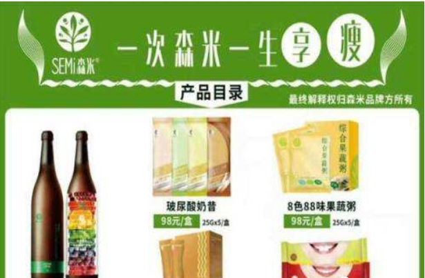 森米是一款号称具有减肥功效的台湾进口产品,他声称不是减肥药也不是保健品,而是食品。森米的主要销售渠道是微商和各大网络销售平台,号称用42天(一疗程)就可以轻松瘦20斤,而且因为是食品还“无副作用,不反弹,还能养成易瘦体质”吃一个疗程需要3564块。可是真实情况却不是宣传的这样,近期森米也遭到许多消费者的投诉,被质疑是通过节食减肥与产品无关。
