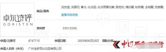 佳多丽在宣传卓尔诗婷品牌时,不遗余力的宣传卓尔诗婷品牌是百年美国品牌,而且暗示该品牌源于1809年、产品是美国进口。实际上,卓尔诗婷3类商标申请于2005年,2012年该商标转让给了佳多丽。卓尔诗婷的产品也并非进口品,而是佳多丽及其关联企业广东顺和恒生物科技有限公司委托国内化妆品生产企业生产的国产货。