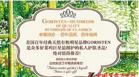 网友还告诉记者,佳多丽官网上宣传“卓尔诗婷--百年品质 百年经典,美国百年经典天然有机明星品牌GORISTEN是众多好莱坞巨星最拥挤的私人护肤圣品!绝对值得推荐!”