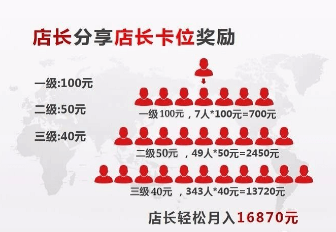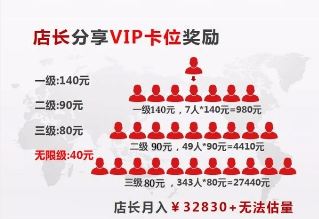 该经销商还介绍,店长享三代同级推荐奖励,即直接(一级)推荐一个店长卡位可拿100元奖励,二代每推荐一个店长可拿50元奖励,三代每推荐一个店长可拿40元奖励。店长最可观的收益不是三代同级别推荐奖励,而是分享低级别VIP会员拿无限代奖励。即除了享受三代同级奖励,店长直接推荐一个VIP卡位,还可拿高达140元的奖励,二级每推荐一个VIP卡位可拿90元奖励,三级每推荐一个VIP卡位可拿80元奖励,四级及其以下的无限级只要推荐会员成功,其均可拿到40元的奖励,店长月收入将无法估量。