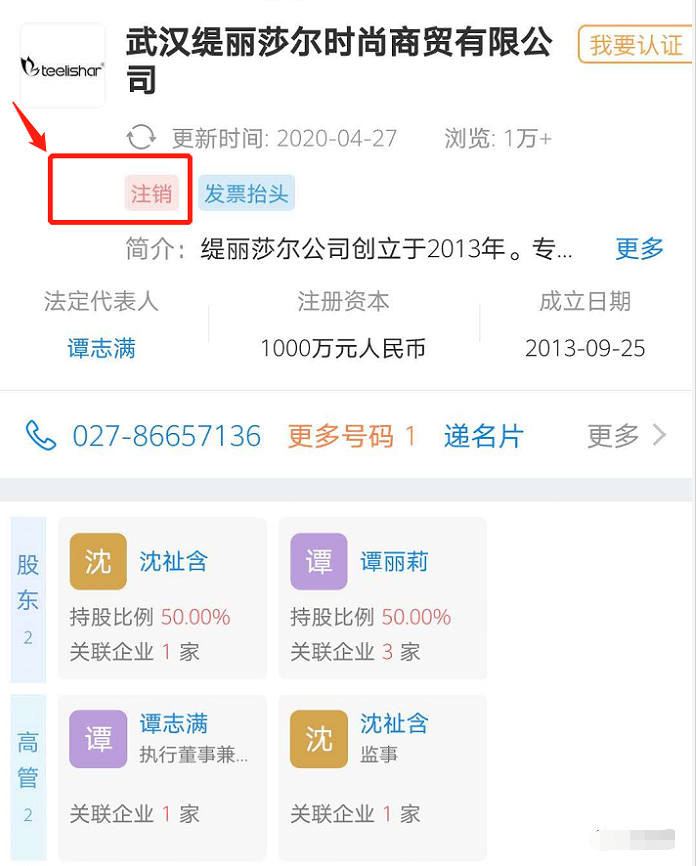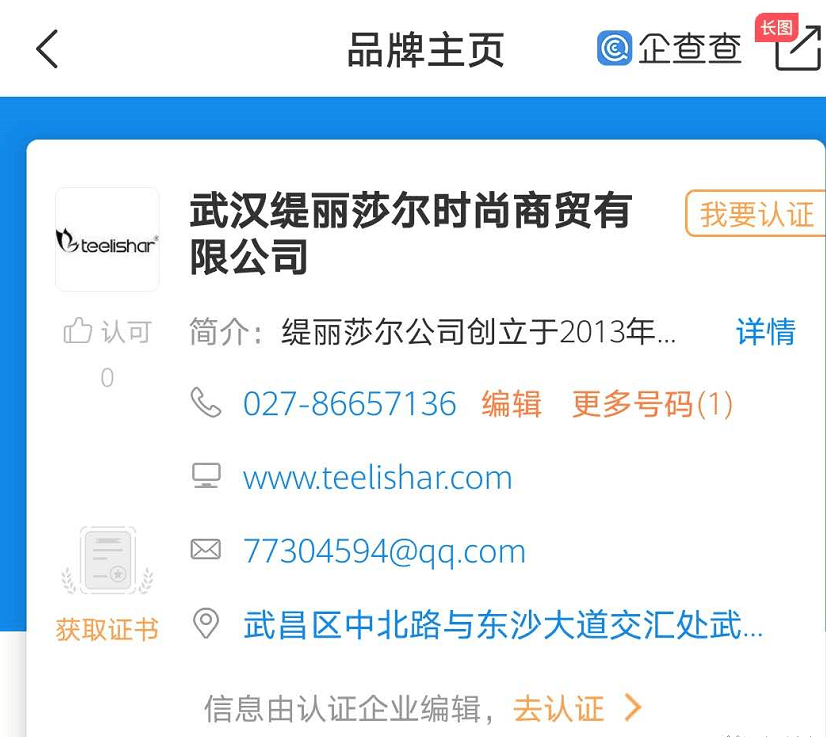 缇丽莎尔品牌最初由成立于2013年9月25日的武汉缇丽莎尔时尚商贸有限公司运营,该公司法定代表人是谭志满,注册资本1000万元,据查询目前该企业已经被注销。