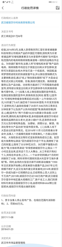 在处罚决定书中写到:2016年3月,当事人获得南京同仁堂乐家老铺健康科技有限公司相关产品的中国区代理权,授权其为乐家老铺品牌“珍嗖啦酵素果冻与米昔营养代餐粉”在中国大陆范围内的电商和微商销售渠道唯一授权的战略合作企业。