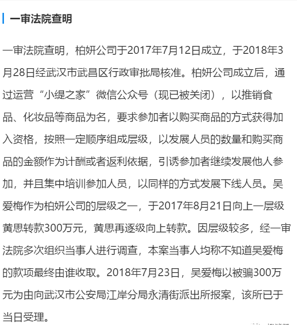 文书中称:从二审查明的事实看,柏妍公司在经营“缇丽莎尔”品牌时,不排除有涉嫌传销的可能性。吴爱梅、黄思都是柏妍公司经营“缇丽莎尔”品牌中的会员,吴爱梅向黄思转账300万元的部分或全部用于“缇丽莎尔”品牌产品的经营,因此,对两人之间权利义务的界定,需以有关部门依法定程序对柏妍公司是否传销的认定结果为基础。