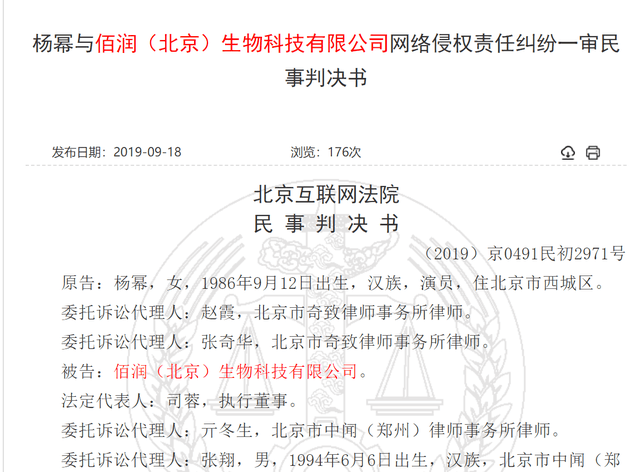 社交财经在中国裁判文书网发现一则《杨幂与佰润(北京)生物科技有限公司网络侵权责任纠纷一审民事判决书》,该《民事裁决书》发布日期是2019年9月18日。