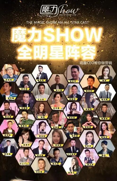 据知情人表示:“魔力show是一个热衷于借势‘明星效应’的品牌,不管是在官方宣传上,还是各种网络推广中。在官方宣传中,魔力show宣传的战略合作明星近百位,包括洪金宝、秦岚、佘诗曼、克拉拉、温碧霞等明星;而在一些网络软文中,更是宣称‘300位TVB明星推荐’。”