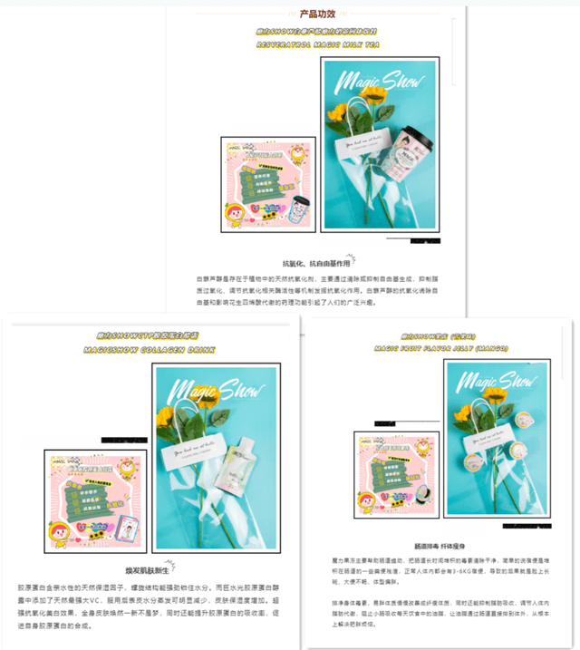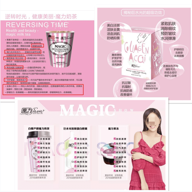 然而以上三种产品却在其官方微信订阅号与代理商的宣传中变成了具有保健功效的产品。社交财经在魔力show官网发现,魔力show胶原蛋白醇露宣传的功效有“美白淡斑、防晒抑黑”、“雕体塑形、自然丰胸”、“抗过敏、抗病防癌”、“保护心血管”、“延缓更年期、增强记忆力”等;魔力show奶茶宣传的功效有“抗疲劳、亮白淡斑、有效减脂塑形、提高免疫力、消除炎症困扰、改善血液循环,预防三高,预防疾病,预防癌症、具有很强的抗抑郁效果。”