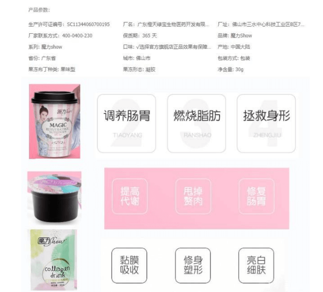 而在天猫平台销售网页上却宣传“魔力show减脂”、“调养肠胃、燃烧脂肪、拯救身形”、“提高代谢、甩掉赘肉”、“修身塑形、亮白细肤”等减肥、塑身、美白等保健功效。